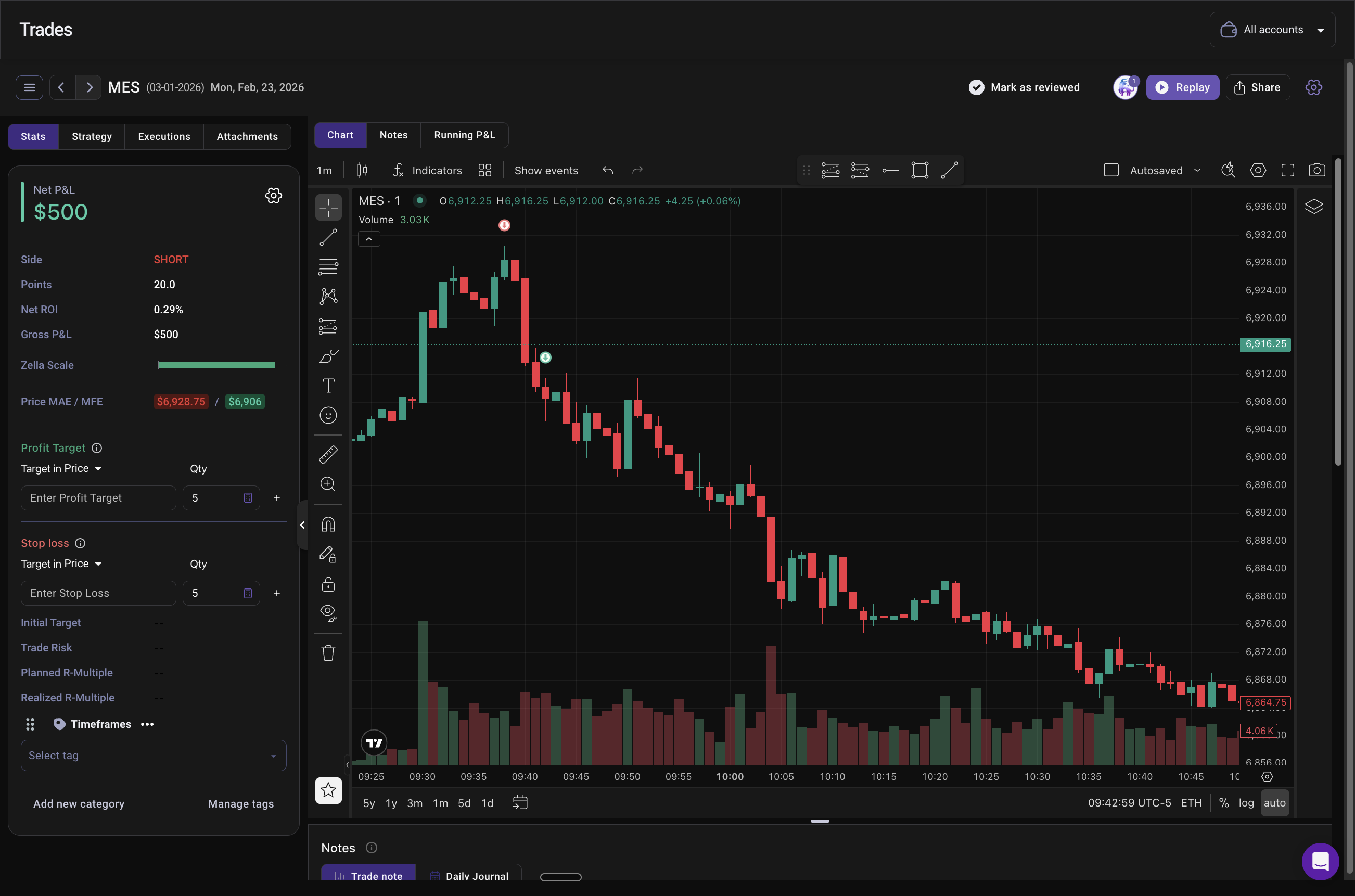Decide your exit before you enter. Set a stop loss (where you'll exit if wrong) and take profit (where you'll book gains) immediately after opening any position. The exact levels depend on your strategy, but having them predetermined removes emotion from the equation. TradeZella's journal tracks whether you followed your exit plan, helping you identify if discipline is affecting your results.