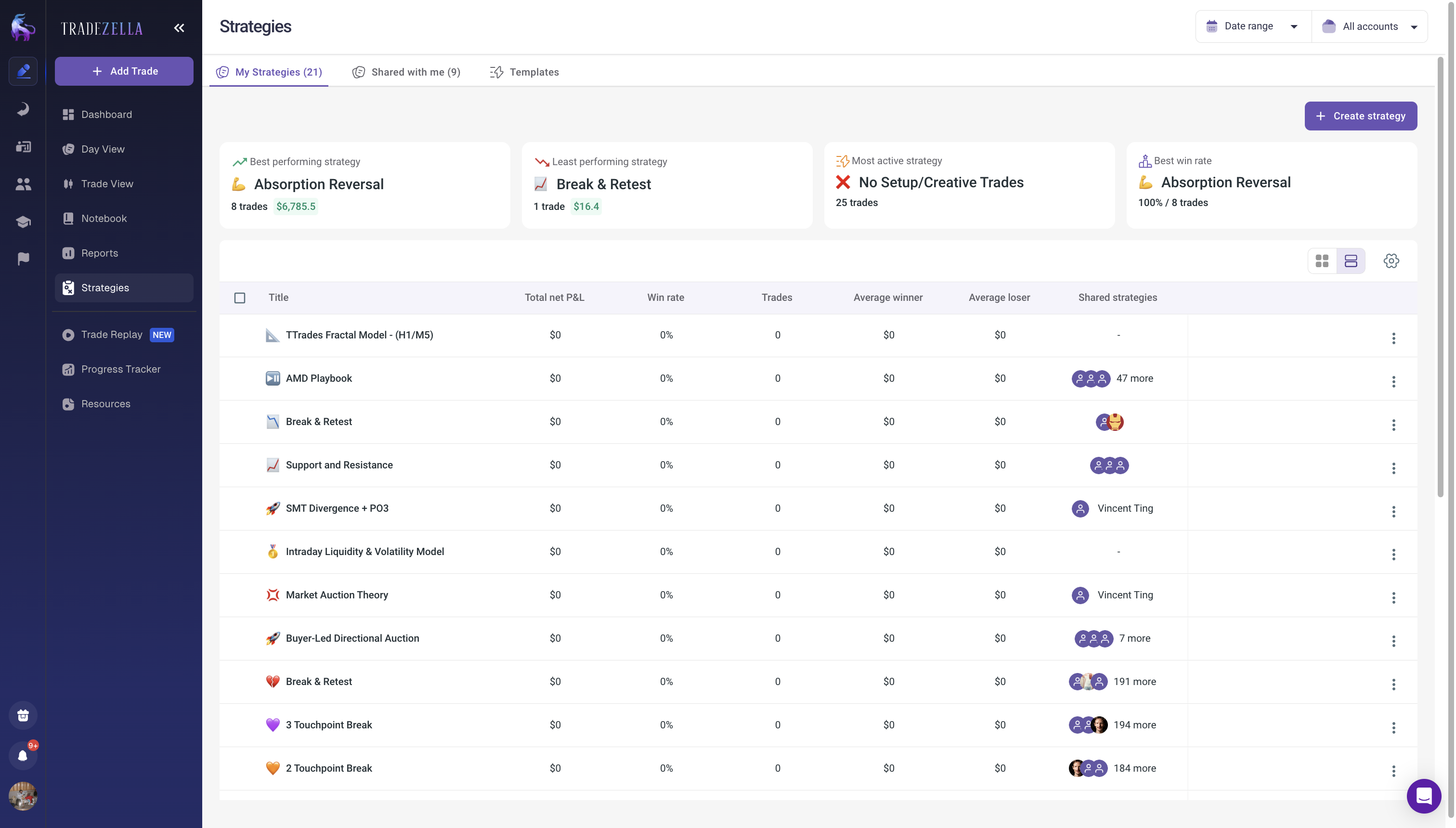 In TradeZella, you can build each of these rules directly into a Strategy. Define your entry criteria, exit rules, position sizing, and no-trade conditions as part of the Strategy setup. Then every trade you take under that Strategy gets tracked automatically, so you can see win rate, profit factor, and R-multiple performance over time and know exactly whether your rules are producing an edge.