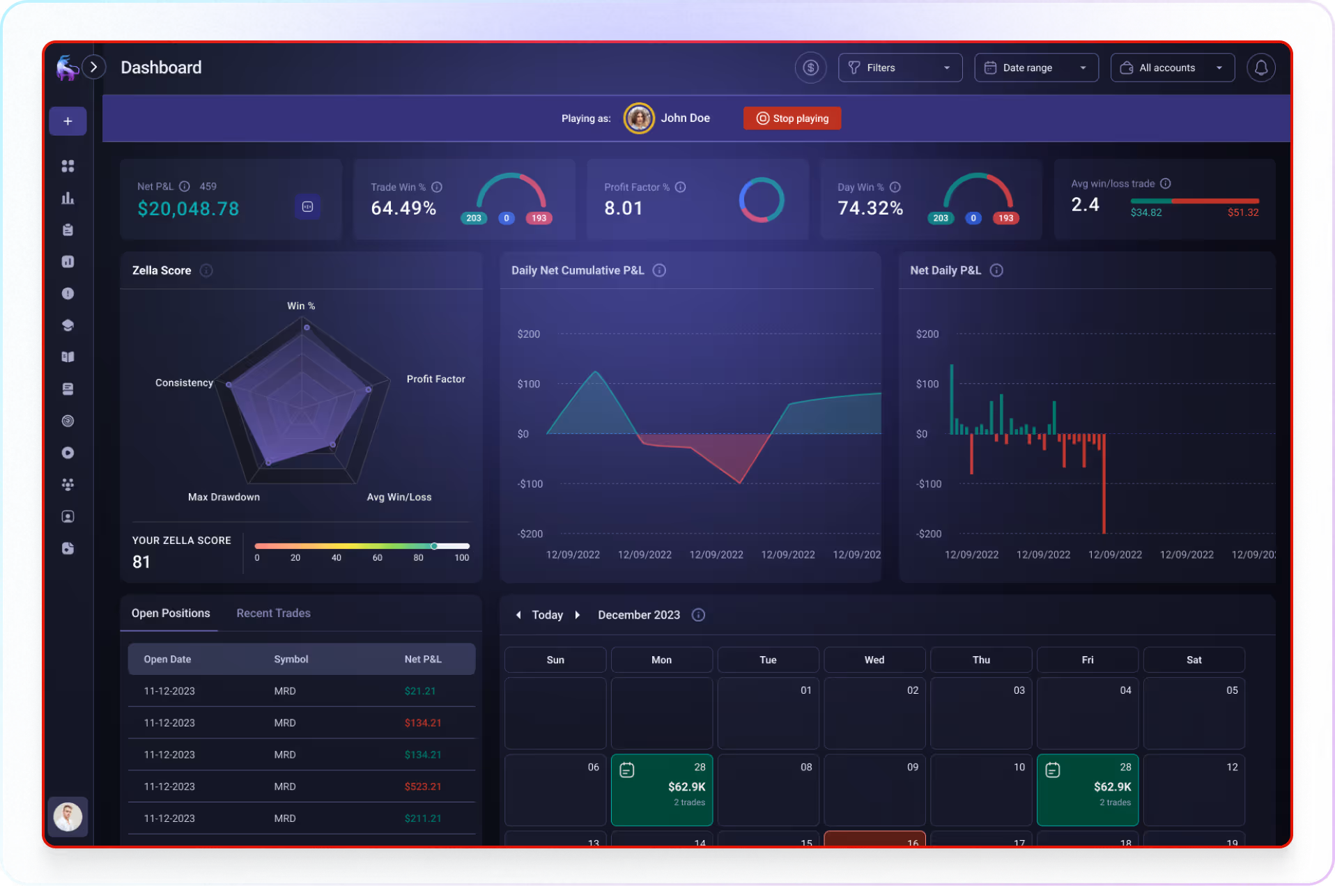 Zella is built by traders, for traders. We've designed and built every feature surrounding the question, "will this help a trader improve their process?" If the answer is no, it's not a necessary feature. There are no bells and whistles. Its clean and straight forward.