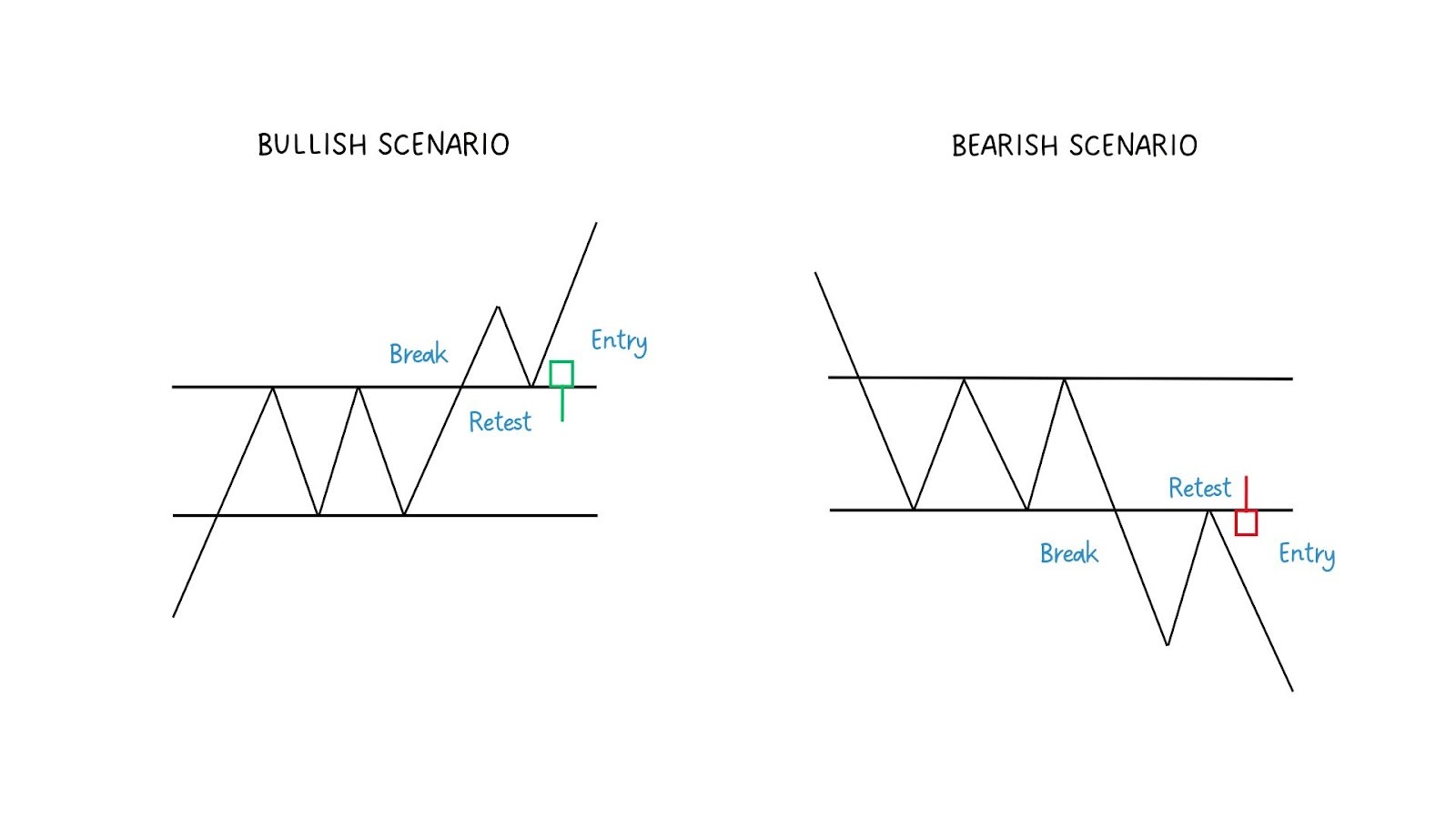 - Retest holds both the one-candle zone and the key support/resistance level
